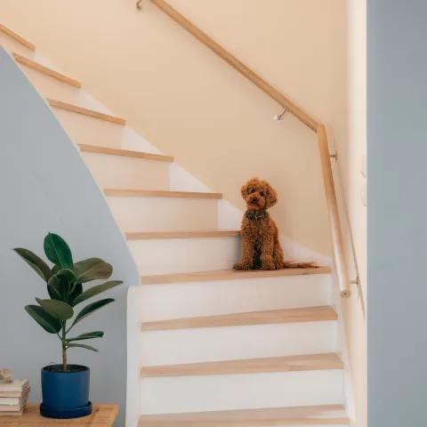 Nudažius šalia laiptų esančią sieną šviesesne spalva, pavyzdžiui, „Halo“ (F462), sustiprėja erdvės jausmas. Ši švelni spalva suteiks šilumos šiai į akis paprastai nekrintančiai namų zonai – ji taps jauki ir atrodys harmoningai. Ta pačia spalva nudažę medines dailylentes suteiksite interjerui vientisumo.