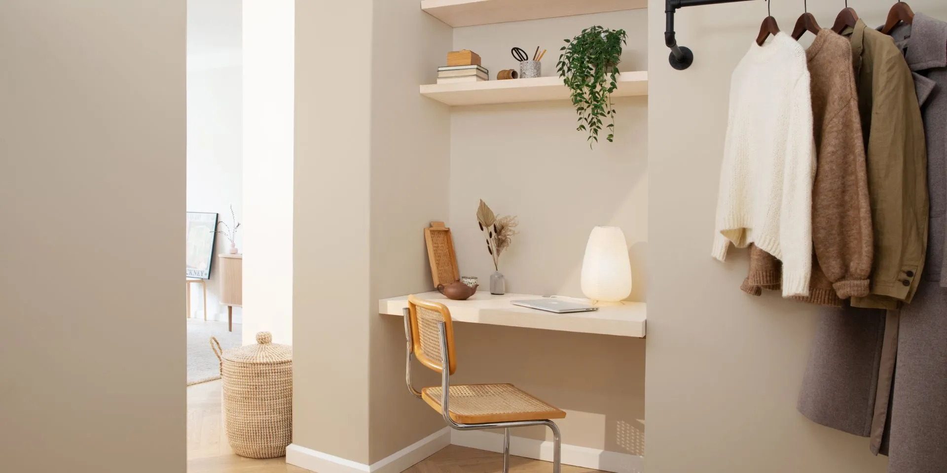 Šio namų minibiuro sienos nudažytos šilta smėlio spalva „Dream“ (X459), kuri yra viena pagrindinių bohemiško interjero stiliaus spalvų. Šviesi rusvai gelsva spalva sušvelnina erdvę ir sukuria darnos pojūtį. Šilta spalva nudažyta siena ir iš natūralių medžiagų pagaminti interjero elementai sukuria atpalaiduojančią atmosferą, nebūdingą tradiciniu stiliumi apipavidalintai darbo erdvei.
