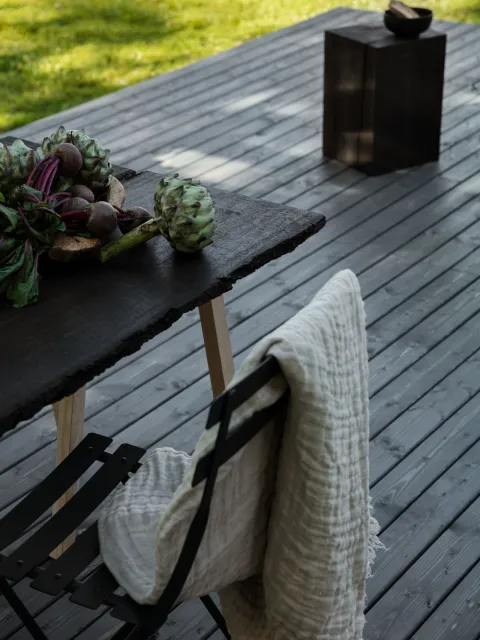 Spalvintas aliejuos leidžia priderinti terasą prie aplinkos. Norite pokyčių? Galite pakeisti terasos išvaizdą pakeisdami jos spalvą. Lauko medienos aliejaus „Valtti Plus Terrace Oil“ yra trijų spalvų: juodo, pilko ir rudo, o aliejų „Valtti Plus Wood Oil“ galima spalvinti bet kuria spalva pagal medienos dažyvių spalvyną „Valtti“. Turėkite omenyje, kad galutinei spalvai visada turi įtakos esama medienos spalva ir būklė, todėl prieš aliejuojant visą terasą rekomenduojame išbandyti aliejų mažame plotelyje.