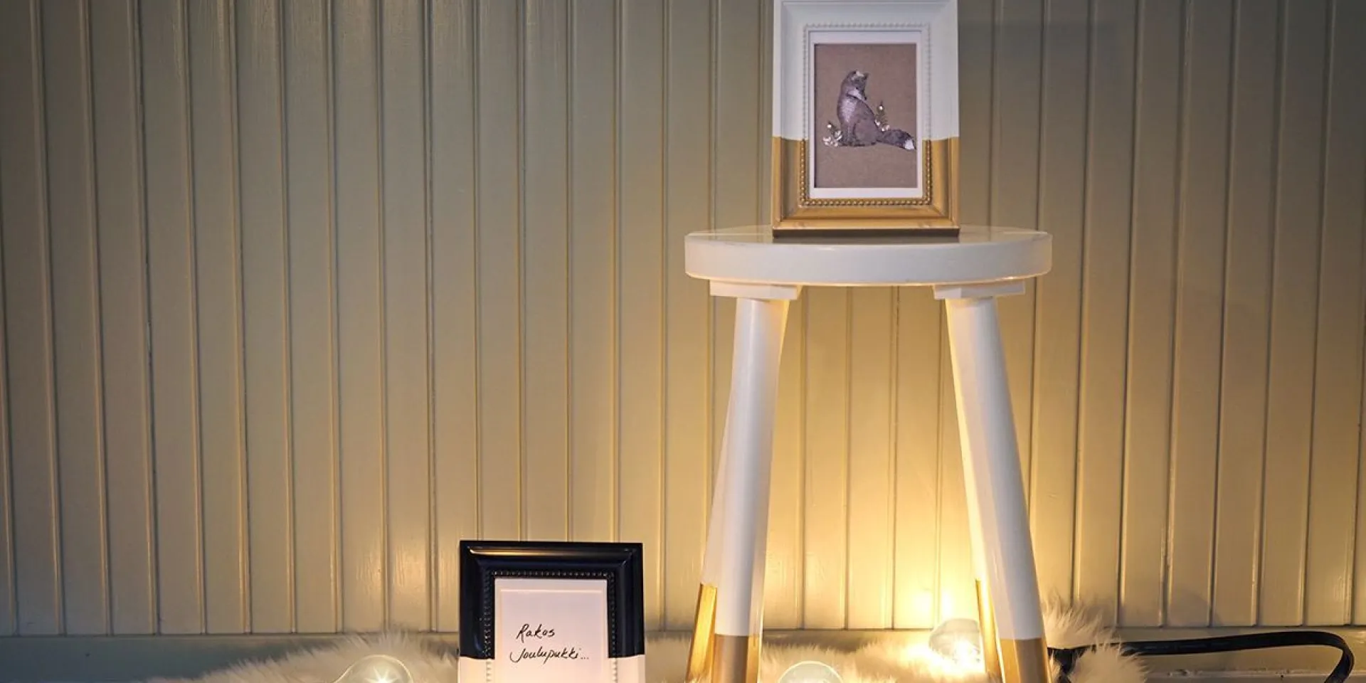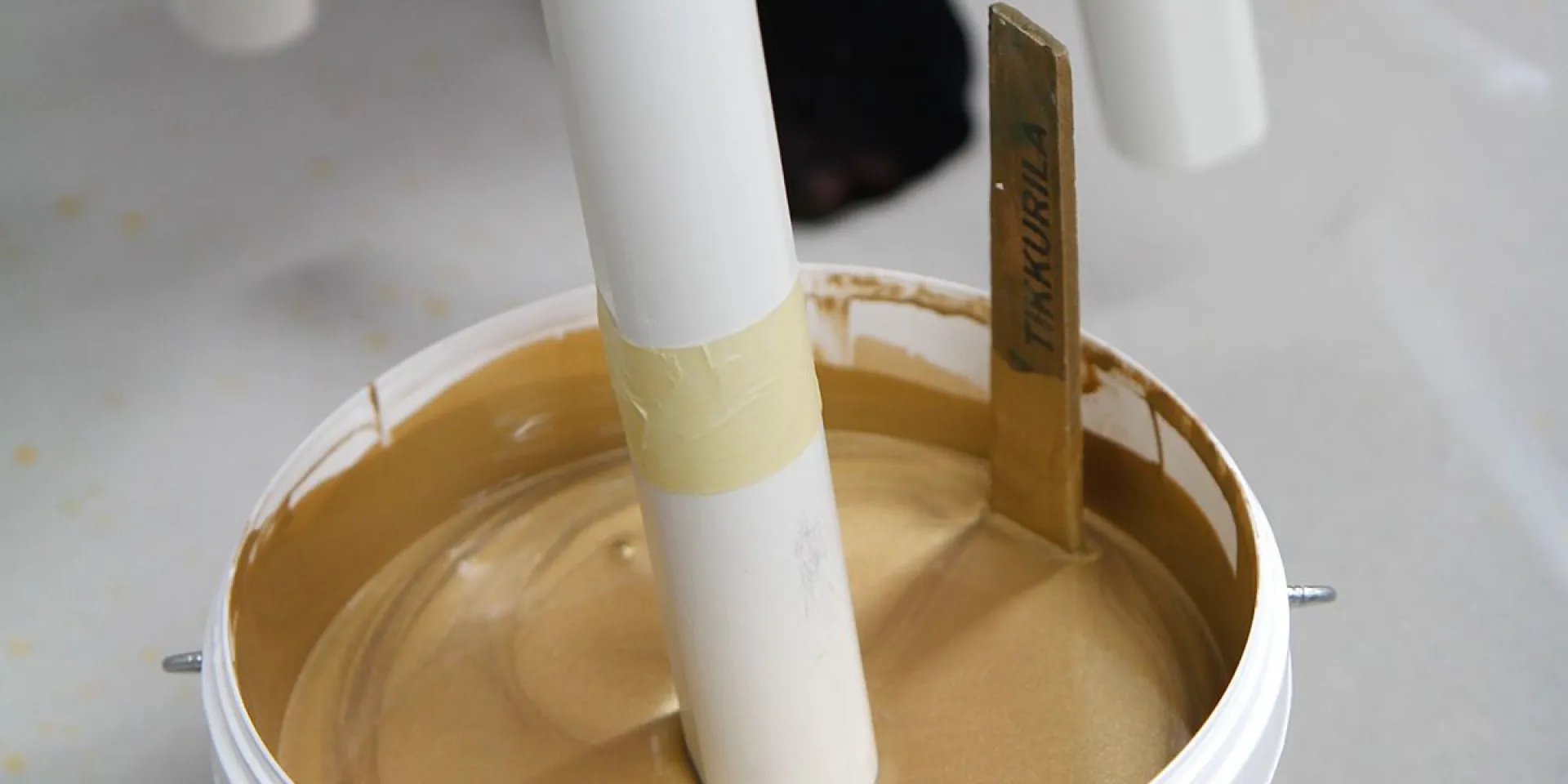 Metalo blizgesys, kurį suteikia „Taika“ dažai, ant balto kėdės paviršiaus atrodys ypatingai! Aukso spalvos akcentai ypač tinka kalėdiniu laikotarpiu. Nuspręskite, kokį kėdės kojų plotą norėsite dažyti ir ties ten užklijuokite lipnią juostą – taip nustatysite tikslias dažymo ribas, išvengsite dažymo netikslumų. Lipnią juostą nuplėškite dar dažams neišdžiūvus.