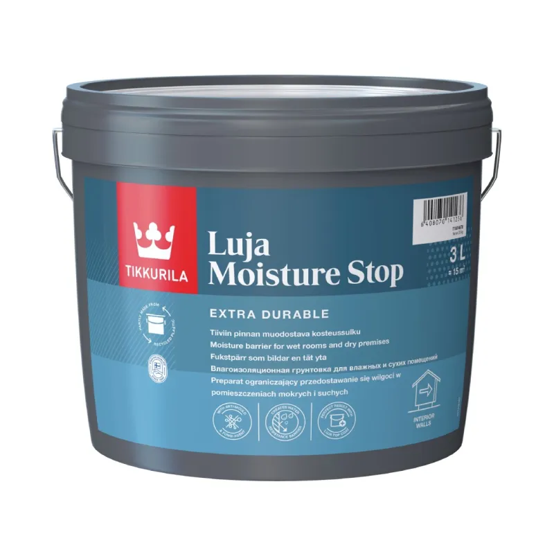 Gruntas „Luja Moisture Stop“ sudaro vandens garams nelaidų sluoksnį ir suteikia dažytiems drėgnų bei sausų patalpų paviršiams papildomą apsaugą nuo drėgmės.