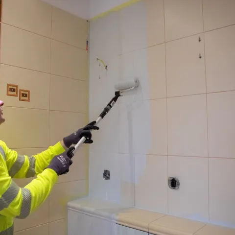Profesionalus dažytojas padėjo Kristinai atnaujinti vonios kambarį atidžiai laikydamasis gaminių duomenų lapuose pateiktos naudojimo instrukcijos. Buvo atlikti šie žingsniai: